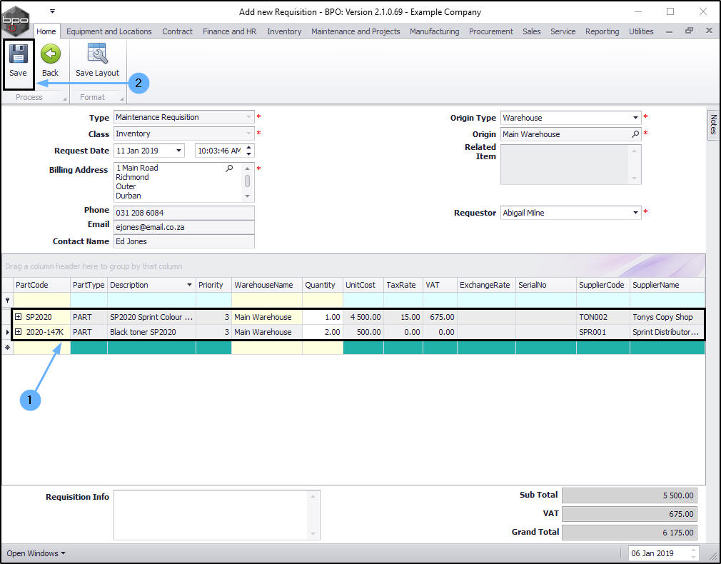 - In this image a Black toner SP2020 has also been added to the Parts data grid.