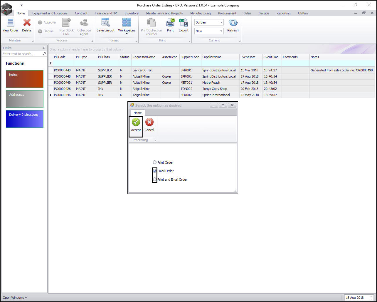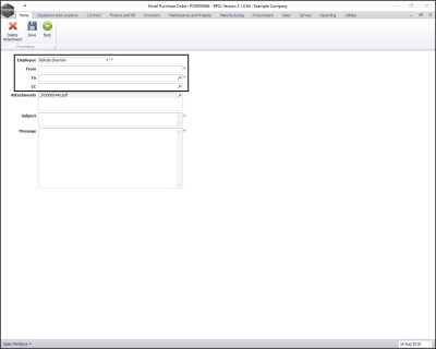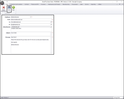 When using the Email option to send a Purchase Order, please note that it will be mailed via the BPO Email Service on the server, not from your own MS Outlook.