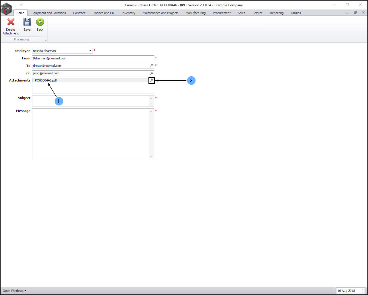 - BPO will create a PDF of the purchase order and attach it automatically. If you wish to include additional attachments, click on the search button in the Attachments field.