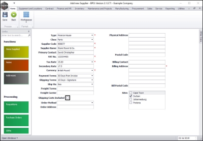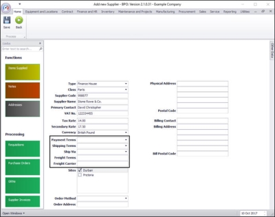 - Type: Click on the drop-down arrow and select from the list the Supplier Type, e.g. General Supplier or Finance House.