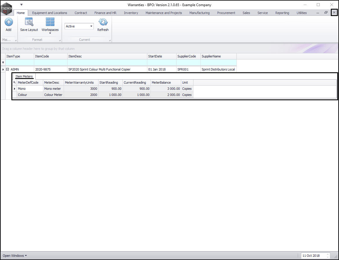 - Here you can view the linked item meters and their Warranty Units, Readings and Meter Balance.