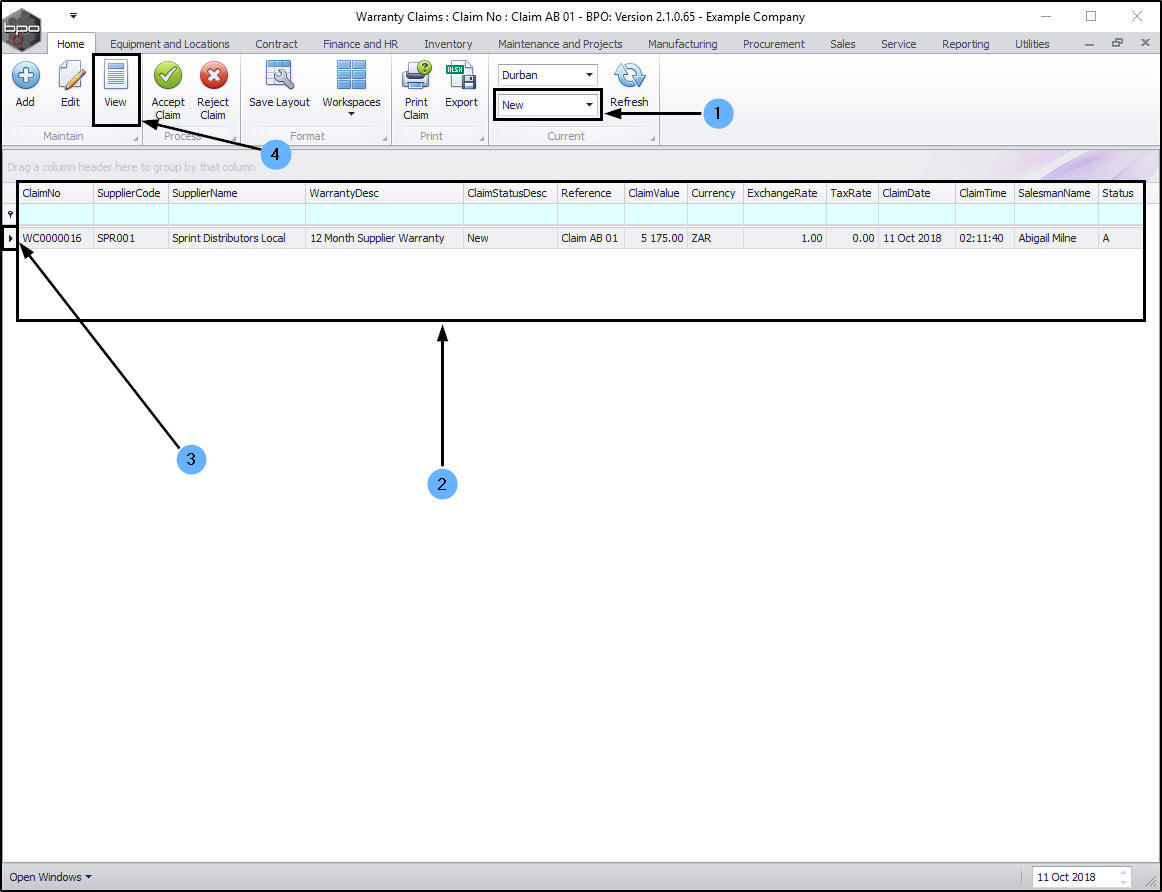 - Click on the row selector in front of the warranty that you wish to view the warranty claims of.