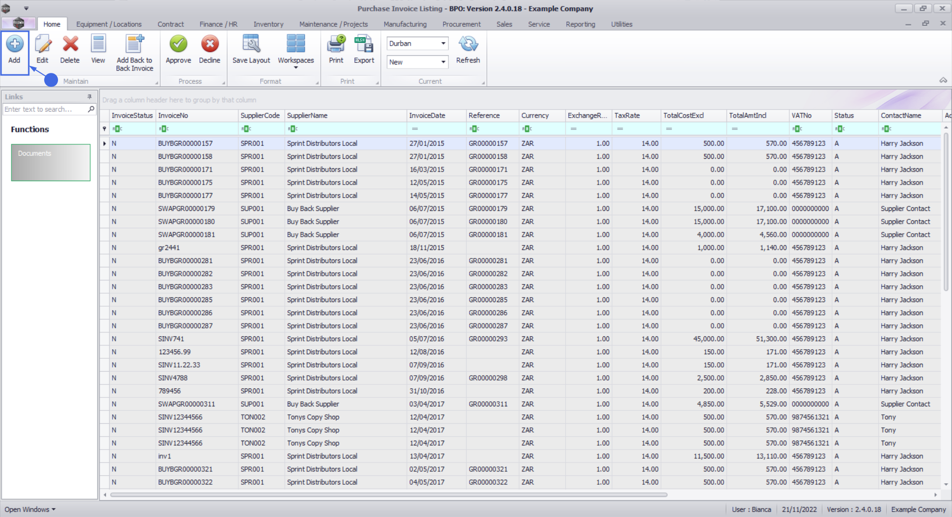 The new Supplier Invoice will display in the Supplier Invoice listing screen. If you do not see it, then click on the Refresh button.