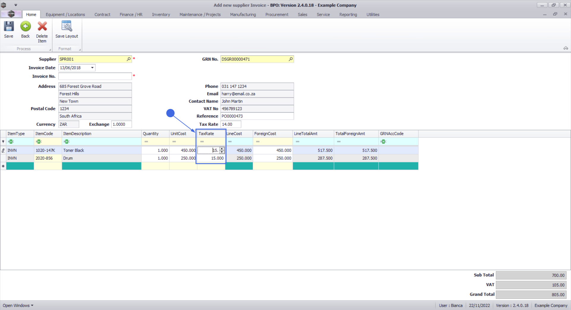 - If a Tax Rate percentage change occurred, and the Supplier detail has not been updated, or if the Supplier Invoice was created prior to said change, you can update the tax rate on the individual line items.
