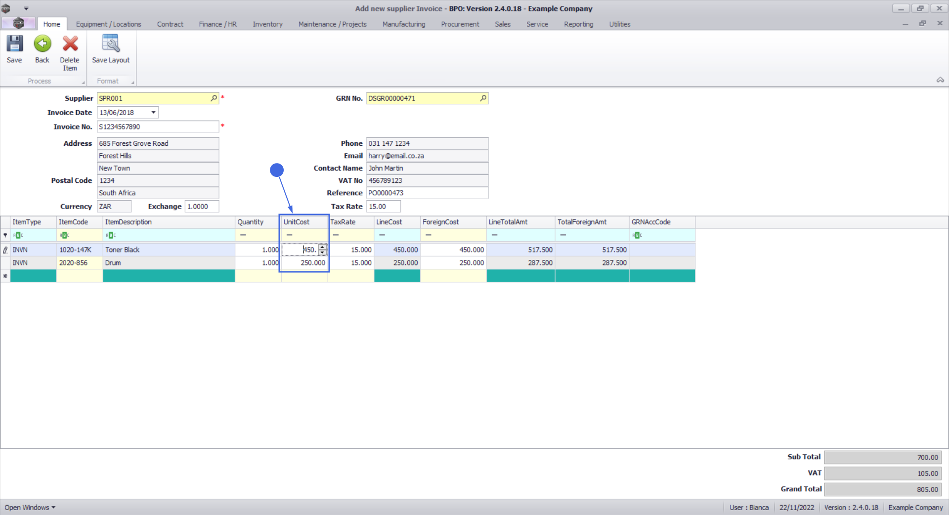 Pricing may have changed between the time the Purchase Order was created and receiving the Supplier Invoice. If the Supplier Invoice is received at the same time as the GRN, the unit costs can be updated when receiving the goods or services and this value will pull through to the Supplier Invoice.