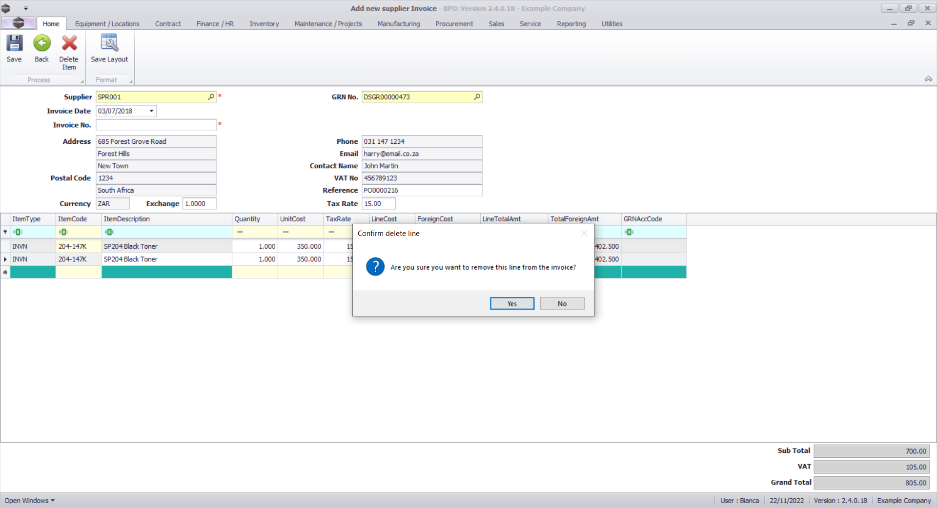 A message box will come up asking: Are you sure you want to remove this line from the invoice?