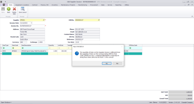 If quantities were changed change, a message box will come up noting: The quantity of items on the Supplier Invoice is different from the quantity of items on the corresponding GRN for Item Code [part number] on row [row number], a manual adjustment is necessary to bring these items (into/out of) stock. Is this correct?