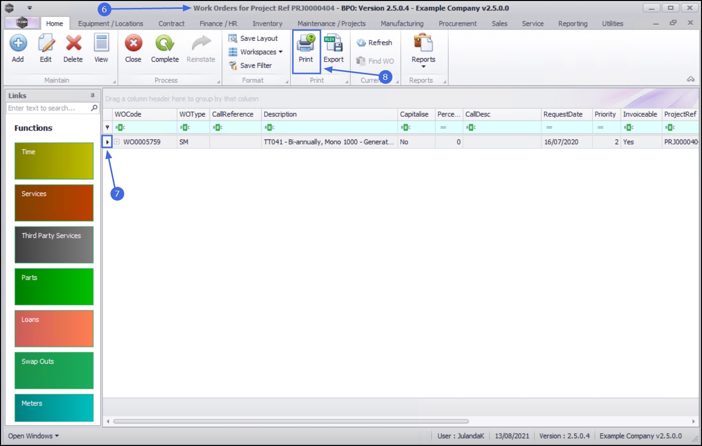 - Click on the row of the project which contains the work order for which you wish to print a Work Order Report for.