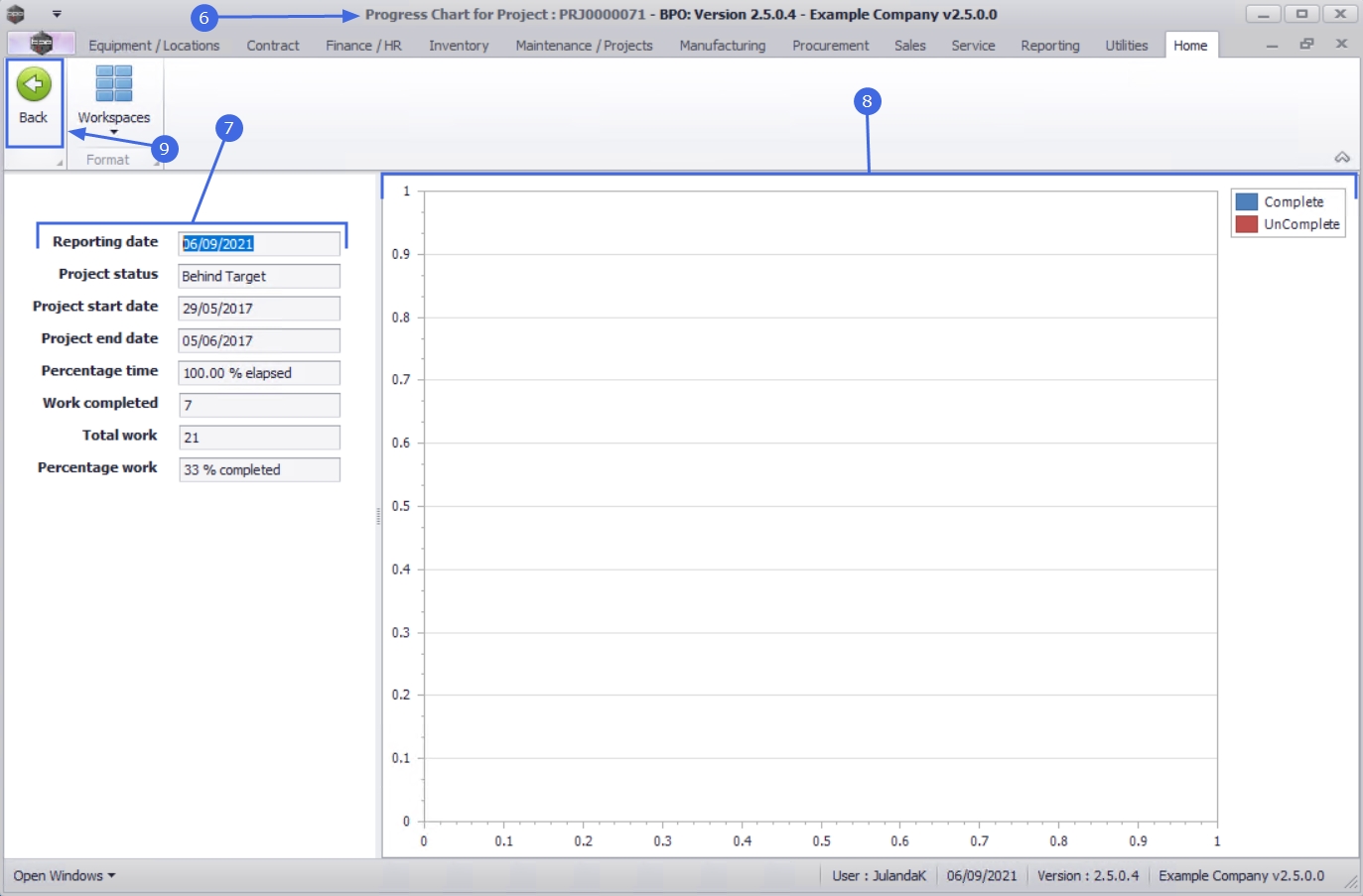 - The Chart frame will plot the chart information in a stacked Column View where you can tract the work that have been Completed and work that reflect as UnComplete.
