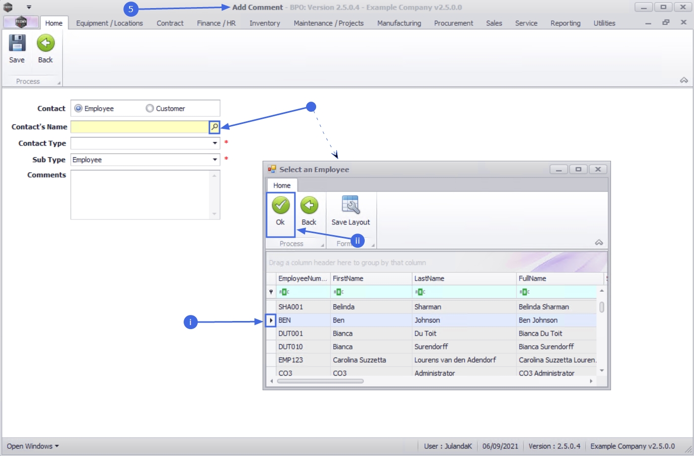 - Contact's Name: Click on the search button to display the Select an Employee list.