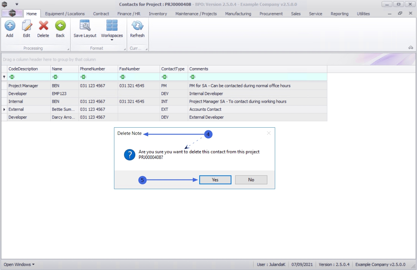 - Are you sure you want to delete this contact from this project PRJ[project ref number]?