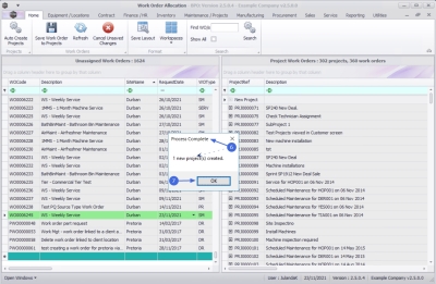 The Auto Create Projects process creates projects from work orders with matching parameters.
