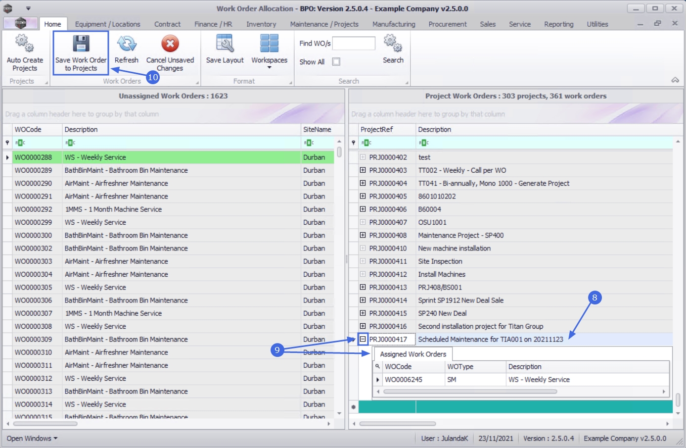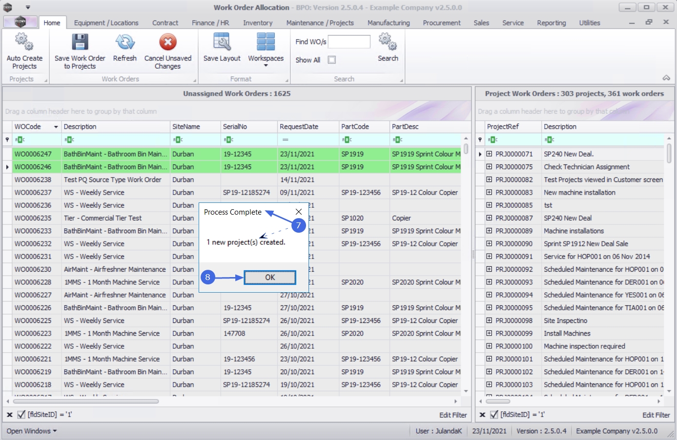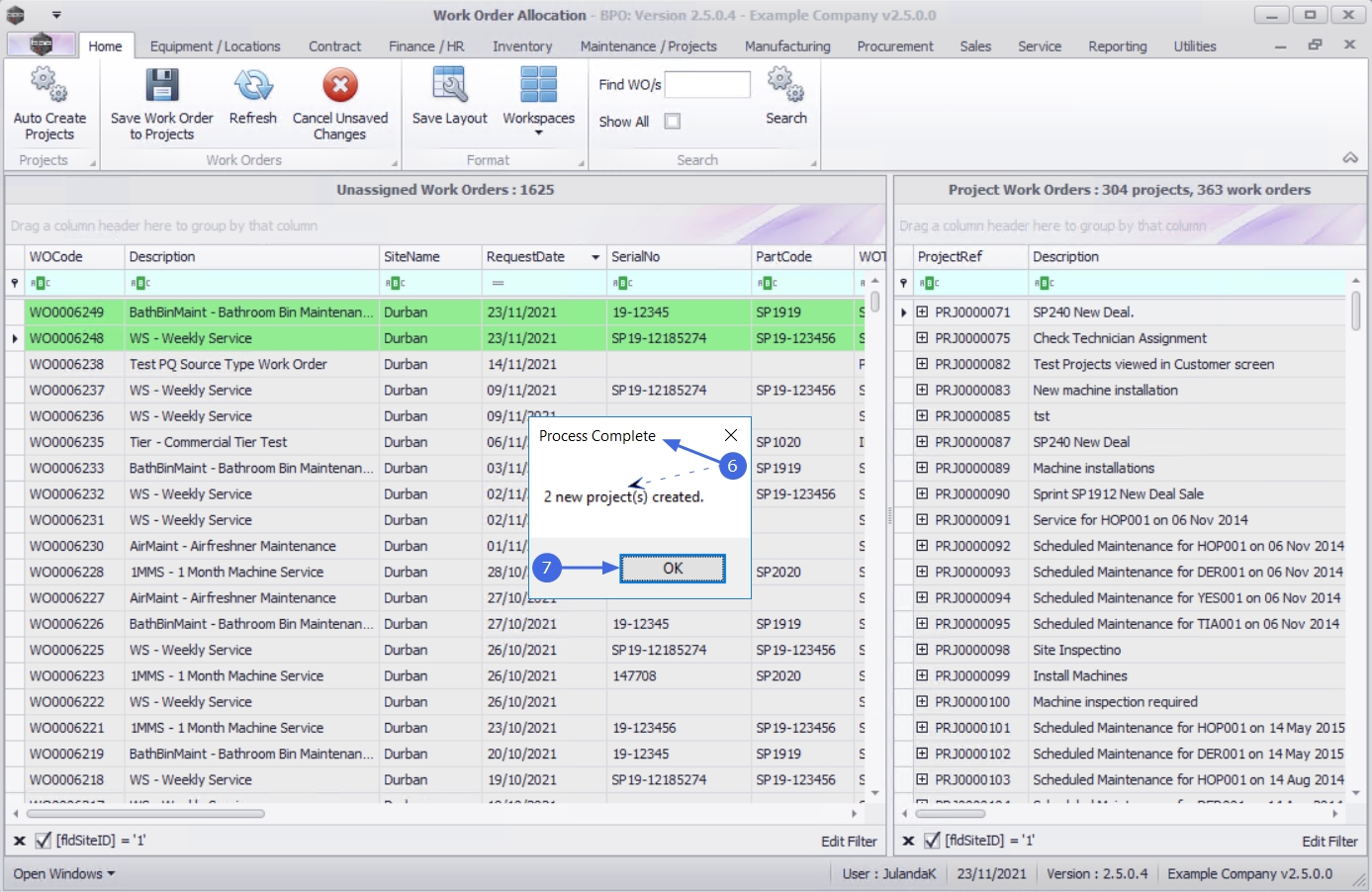 - The newly created projects will be displayed in the Project Work Orders frame.