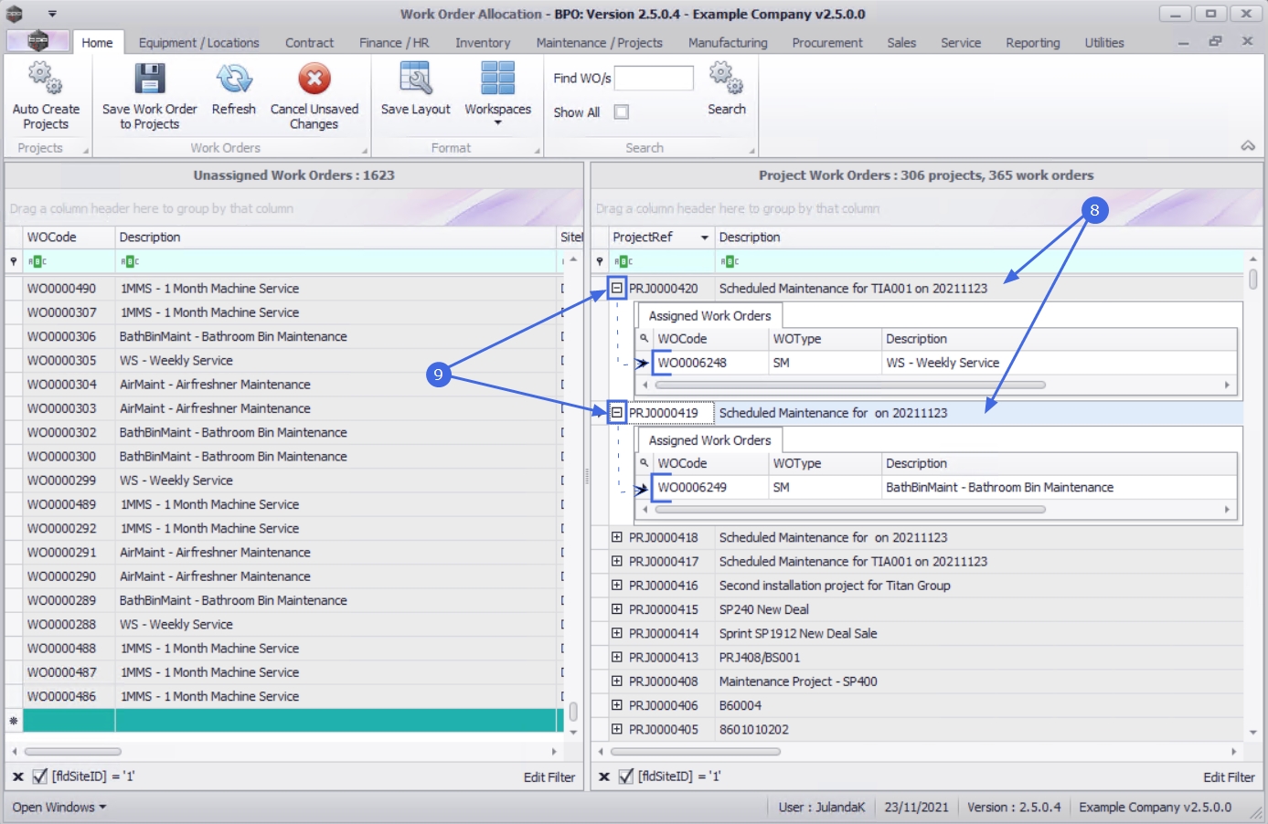 In the Unassigned Work Order frame, select the Work orders you wish to allocate to a project.