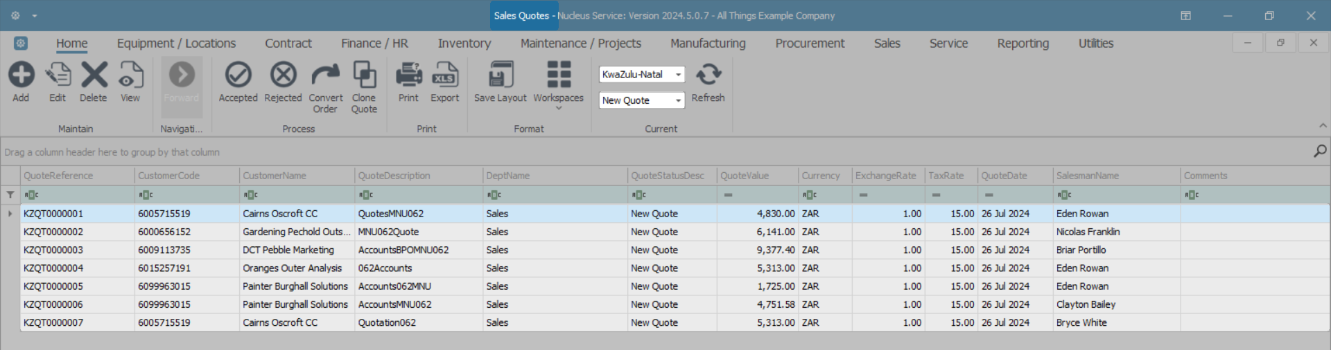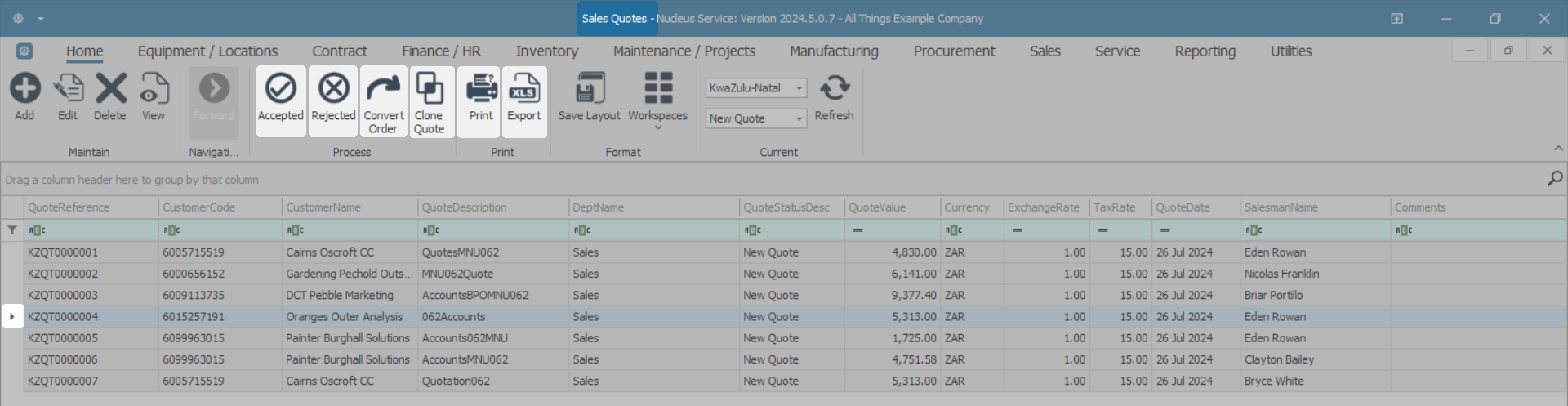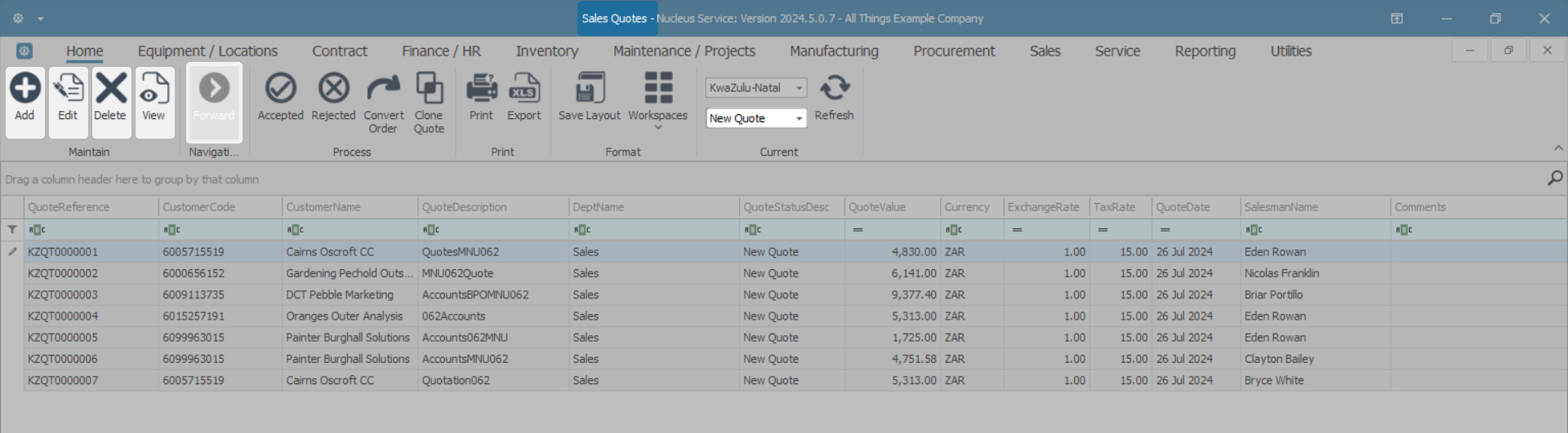 - From the Maintain ribbon section you can choose to Add, Edit, Delete or View a Sales Quote.