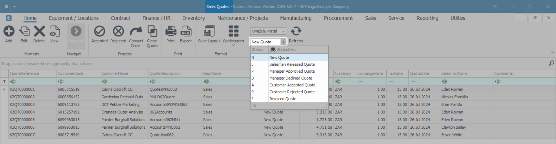 - The Sales Quotes listing screen opens in the N - New Quote Status by default.