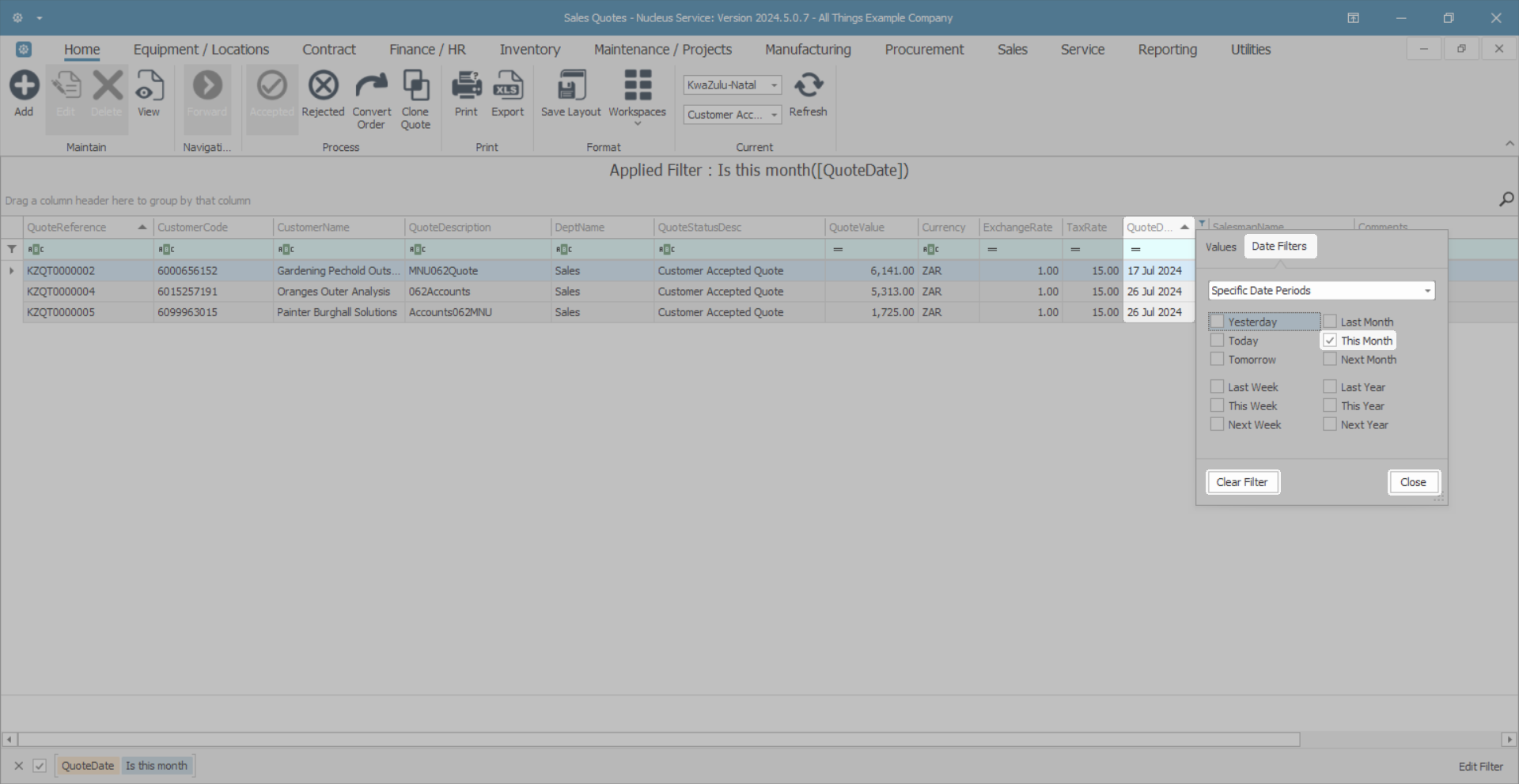 - Click on the filter next to QuoteDate to display the Date Filters selection box.