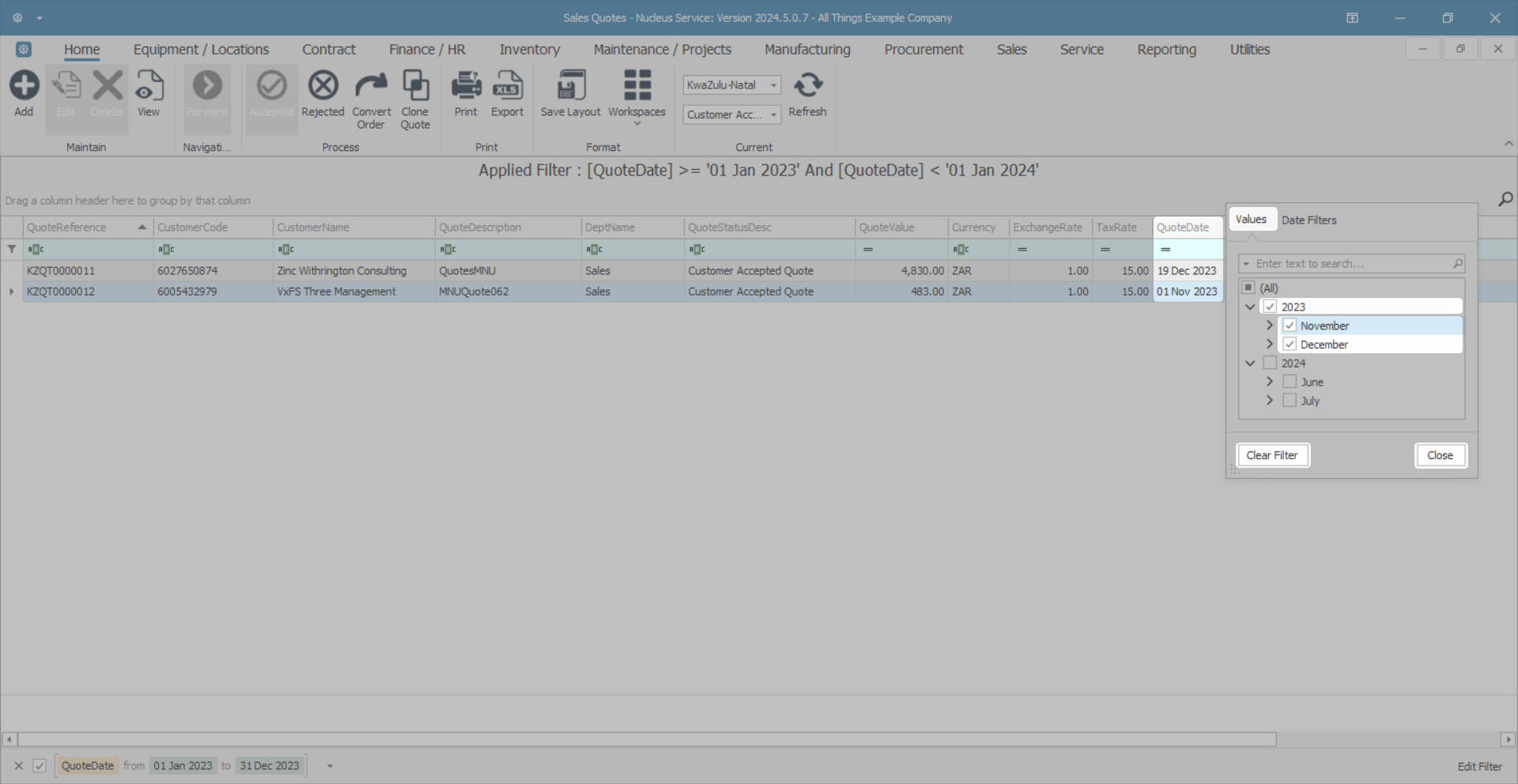 For the purpose of this example, the list of Customer Accepted Sales Quotes has been filtered using the Quote Date.