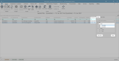 - Click on the Values Tab on the Date Filter screen to display a date summary of the Sales Quotes that have been Accepted by Year and Month.
