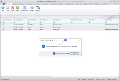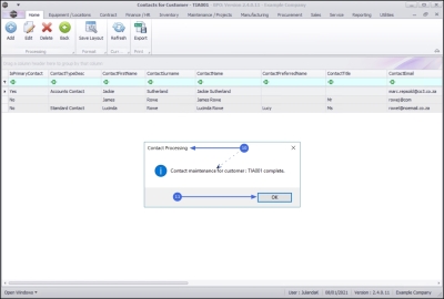 - Contact maintenance for customer: [customer code] complete.