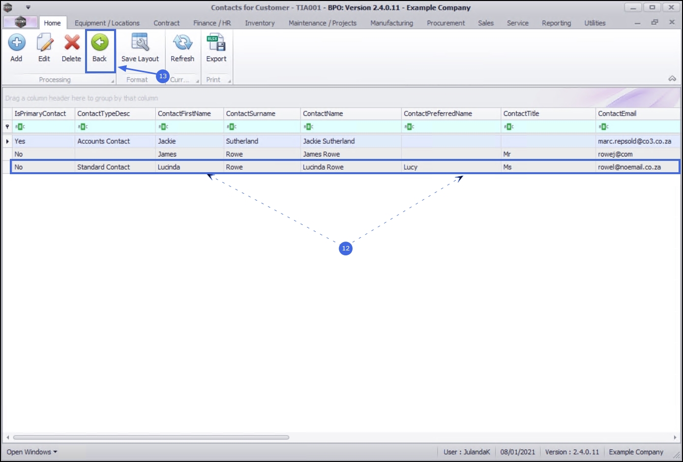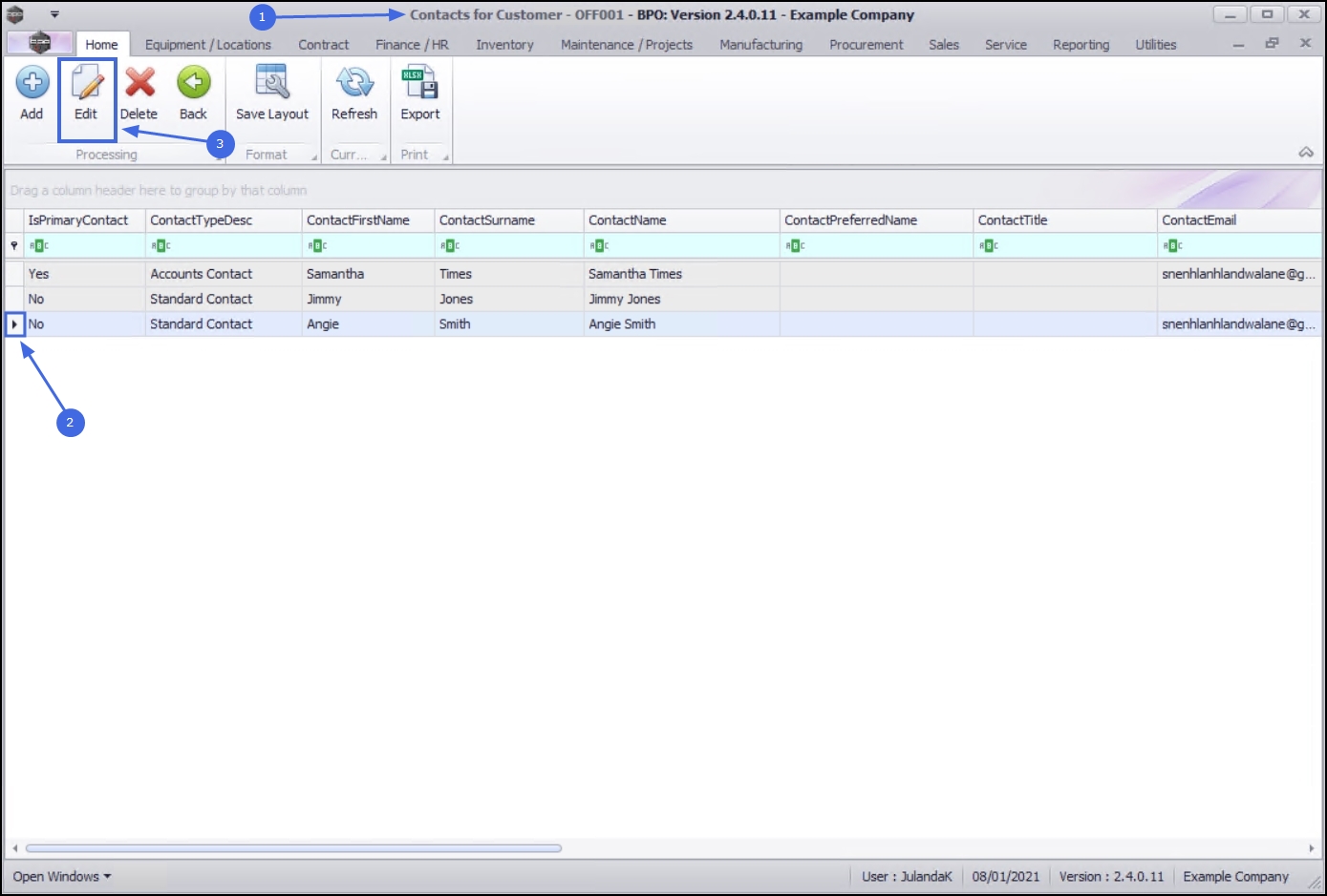 - Select the row of the Contact whose details you wish to change.
