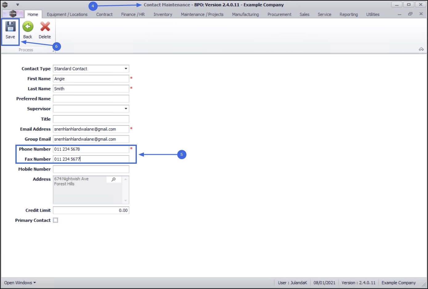 - In this example, the Phone Number and Fax Number have been changed.