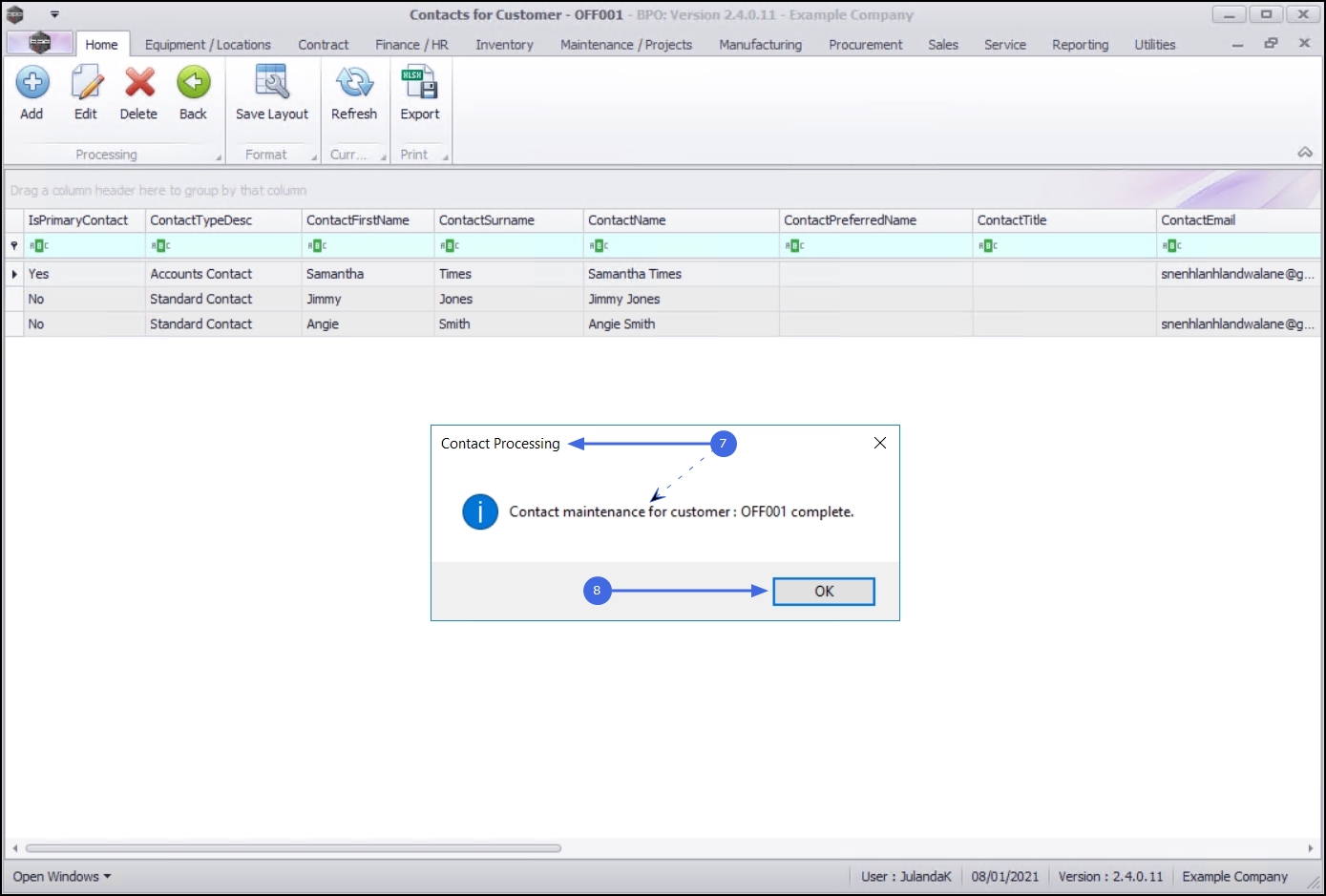- You will return to the Contacts for Customer - [customer code] screen.