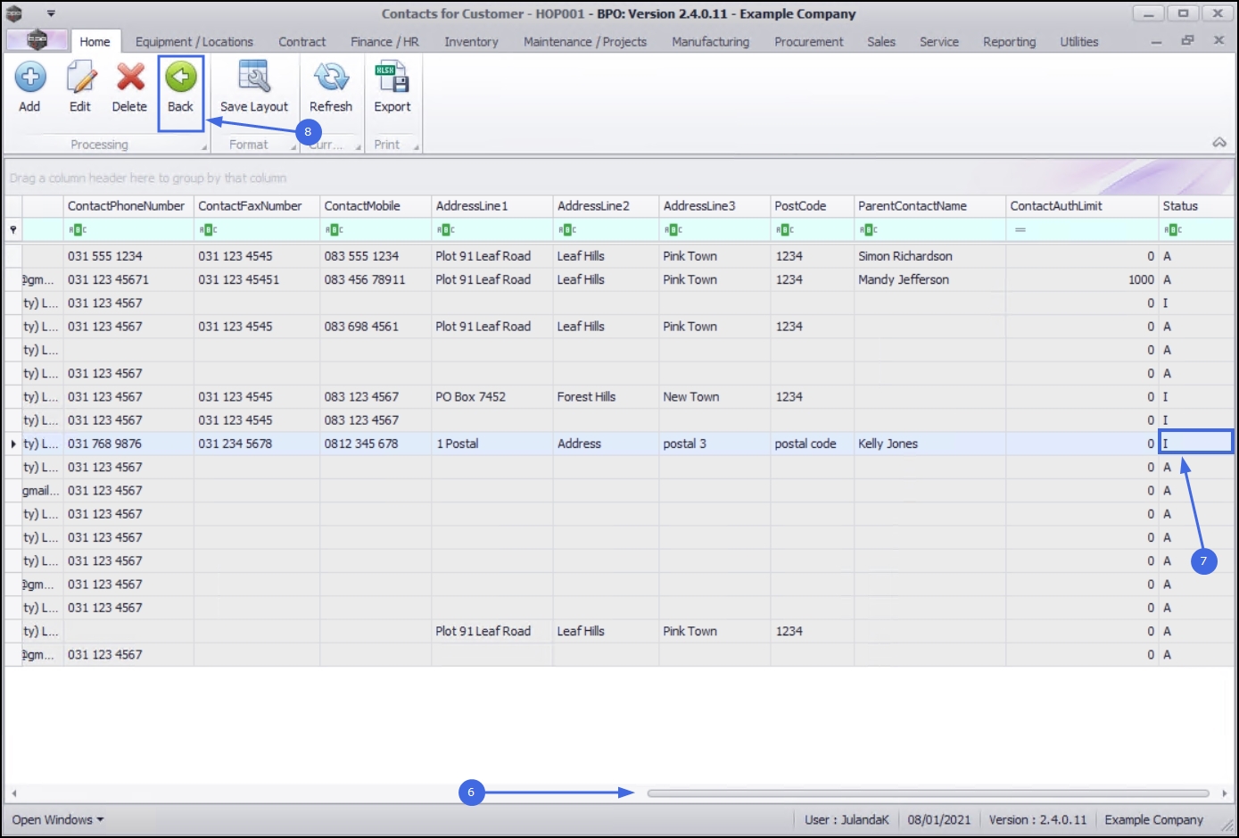 - Use the scroll bar to move across this screen to view the deleted customer contact status.