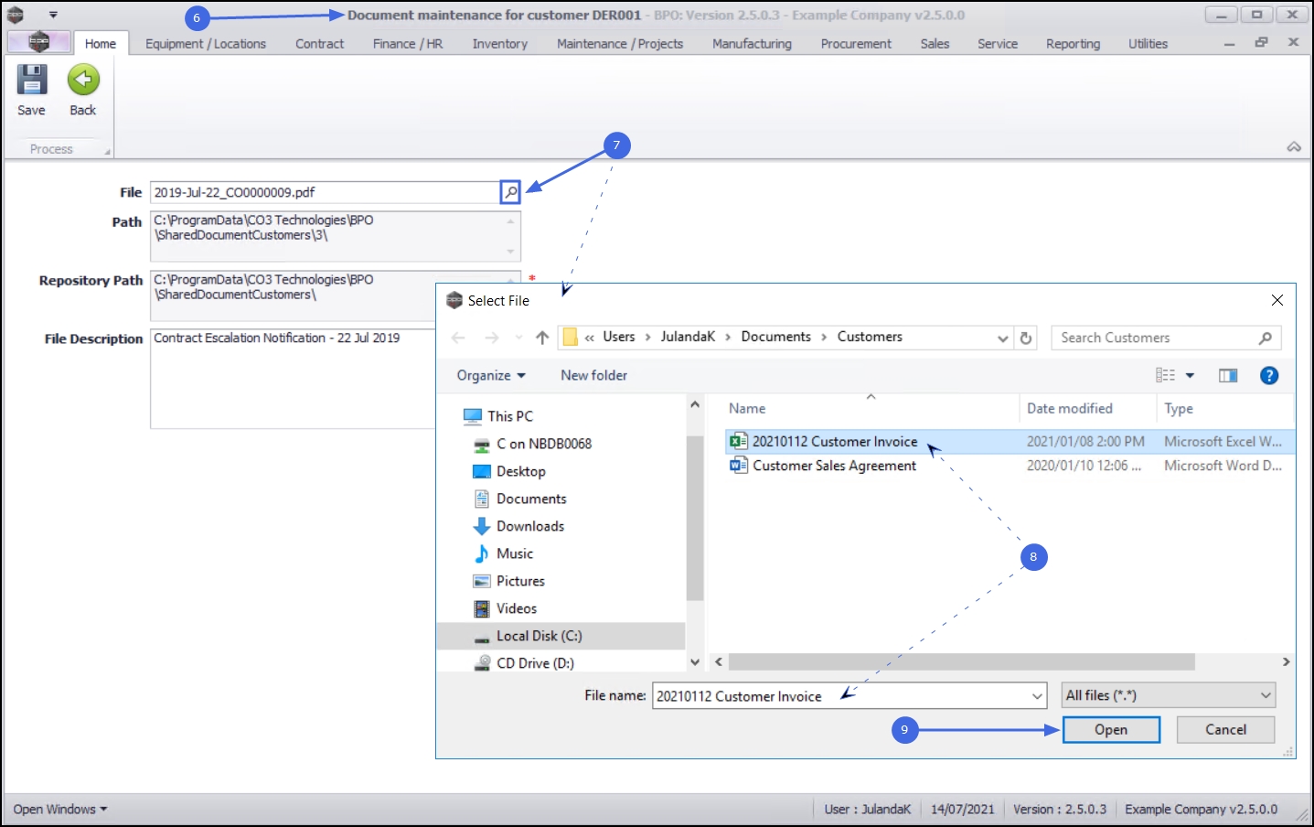 - The Document maintenance for customer [customer code] screen will be displayed with the selected file information populating the fields.