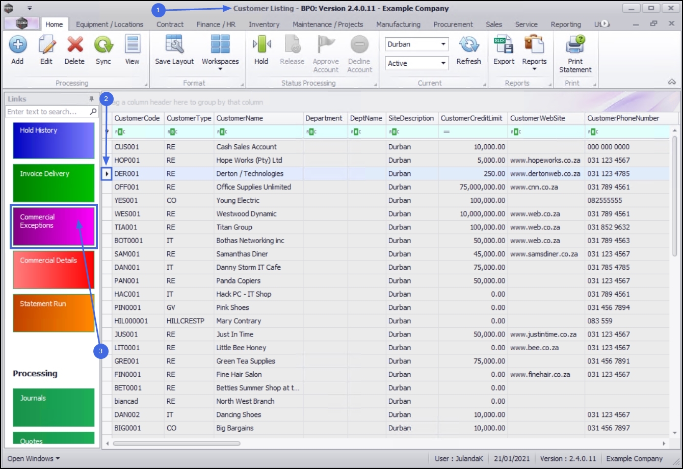 - Click on the row of the customer you wish to link a commercial exception to.