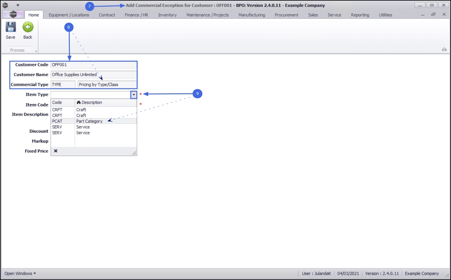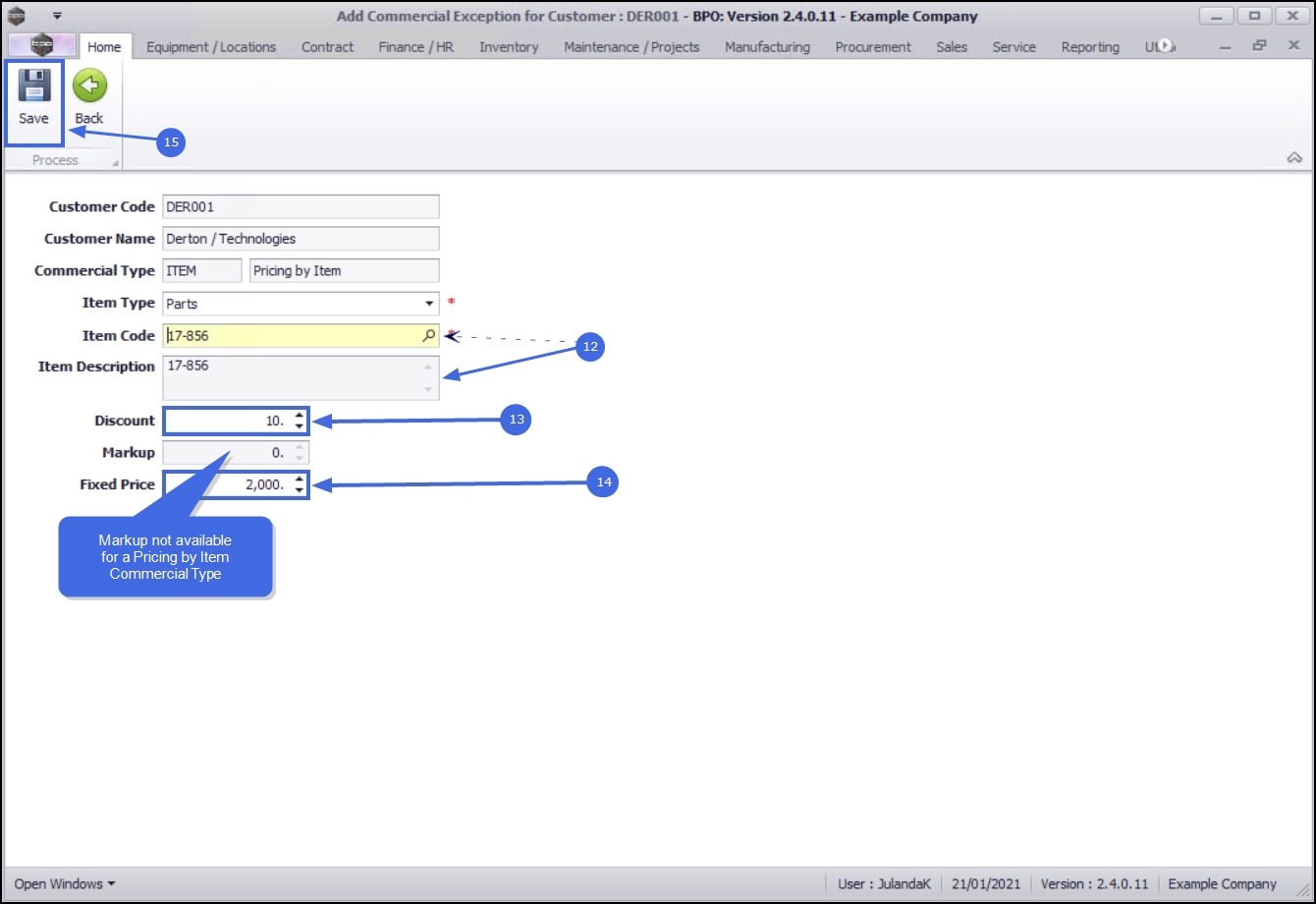 Note 2 As this process is linked to a customer with a Pricing By Item commercial set up, the Markup field will not be editable.
