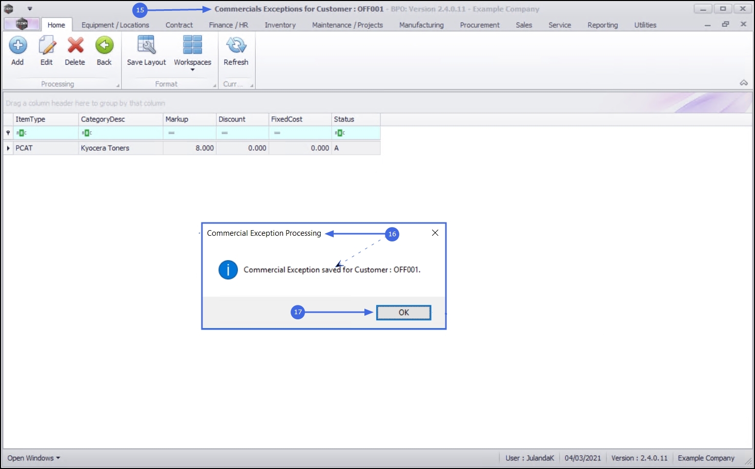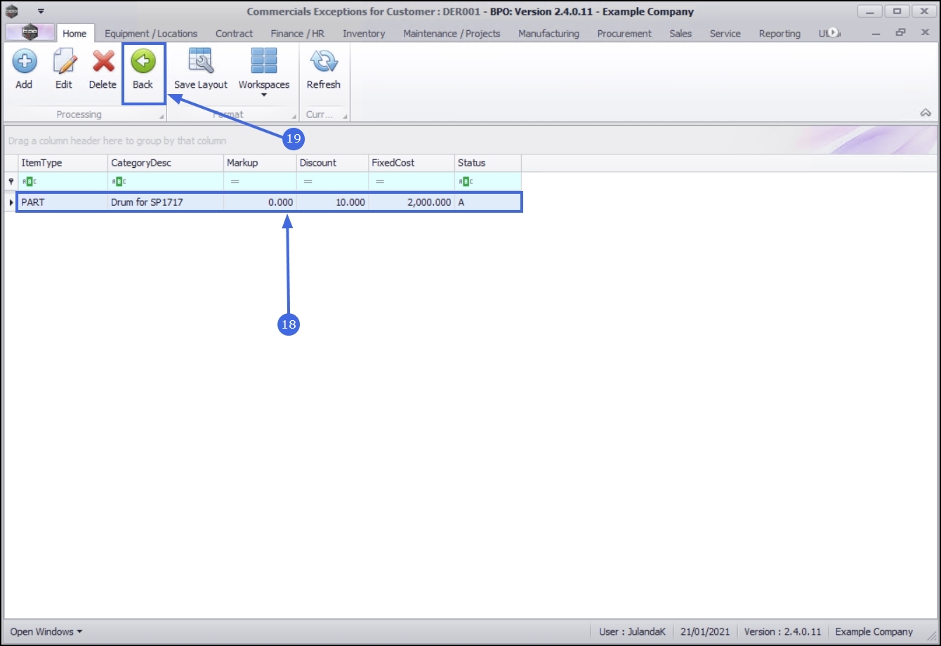 - You will return to the Commercials Exceptions for Customer screen.