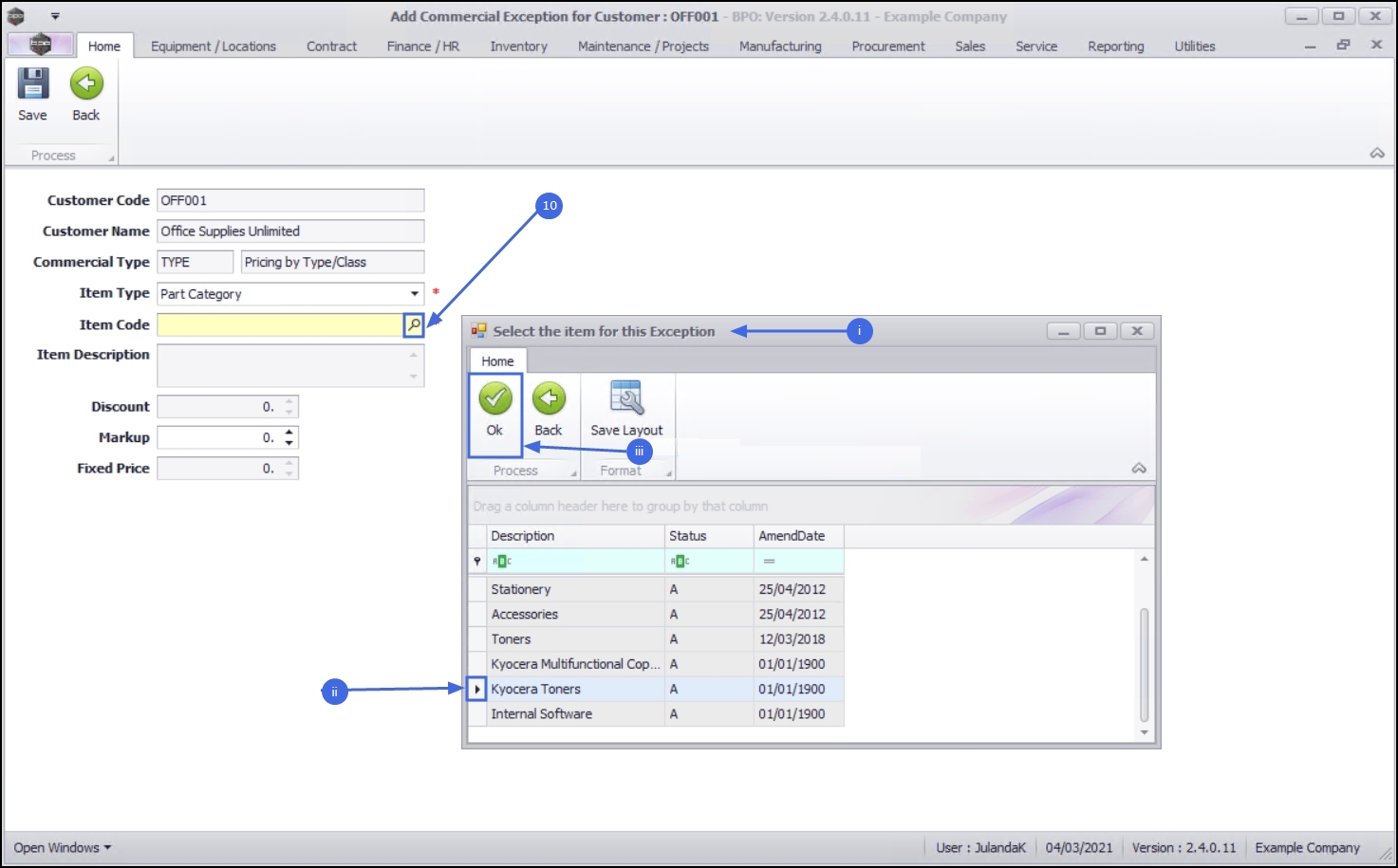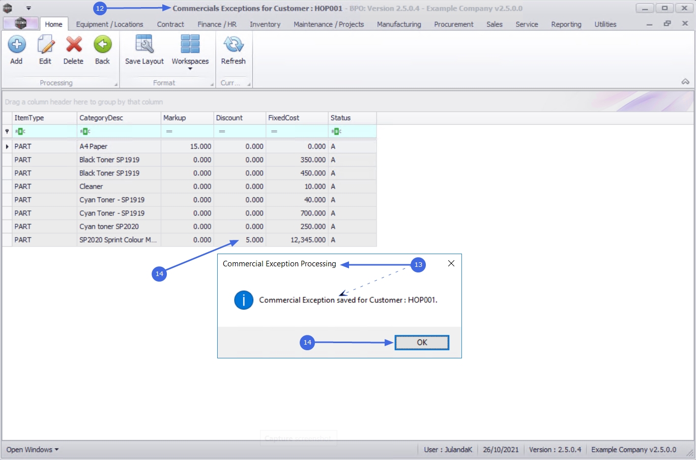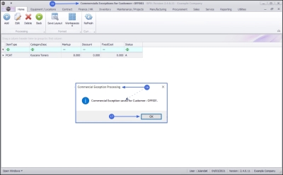 - The Commercial Exceptions for Customer: [customer code] screen will display.