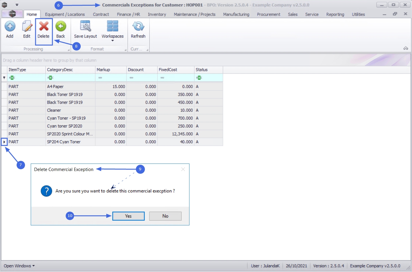 You may wish to remove any Commercial Exception items for a customer that has been linked incorrectly or is no longer used, for instance a machine has been upgraded to a newer model.