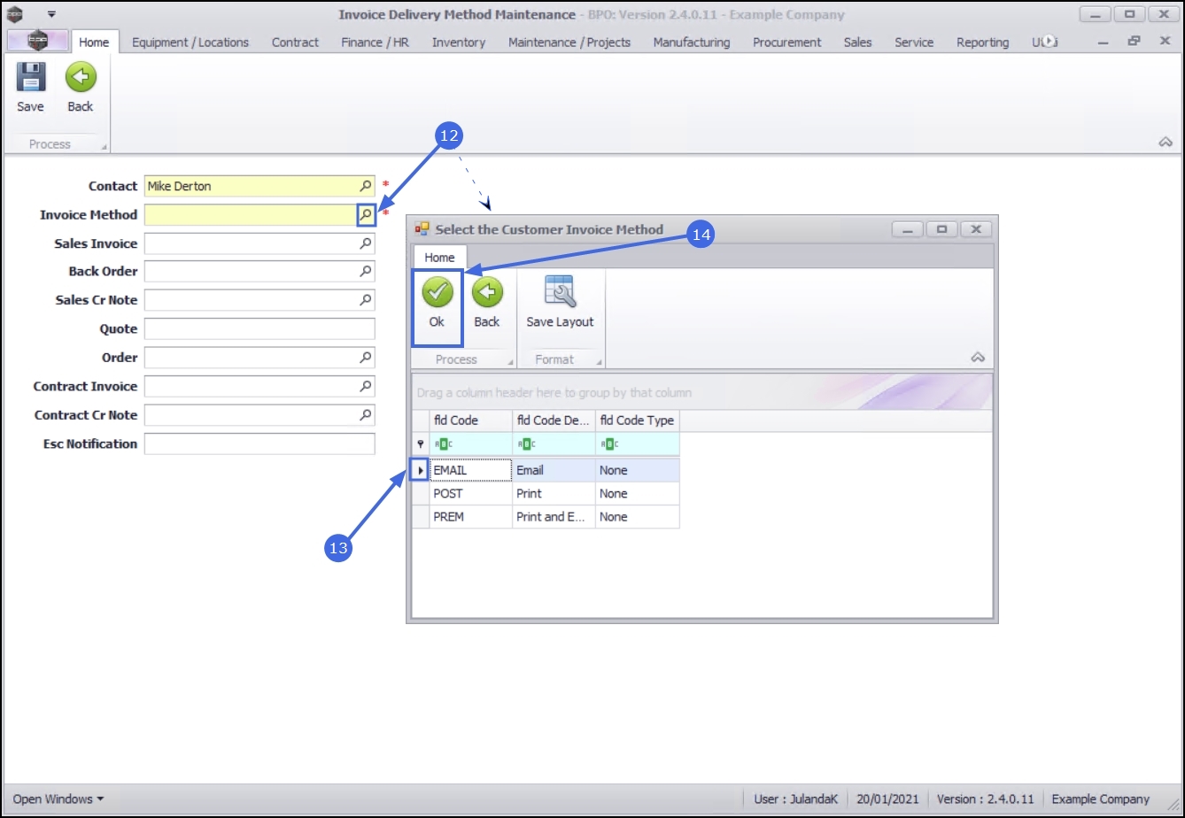 - The Invoice Delivery Methods for Customer: [Customer Code] screen will be displayed.