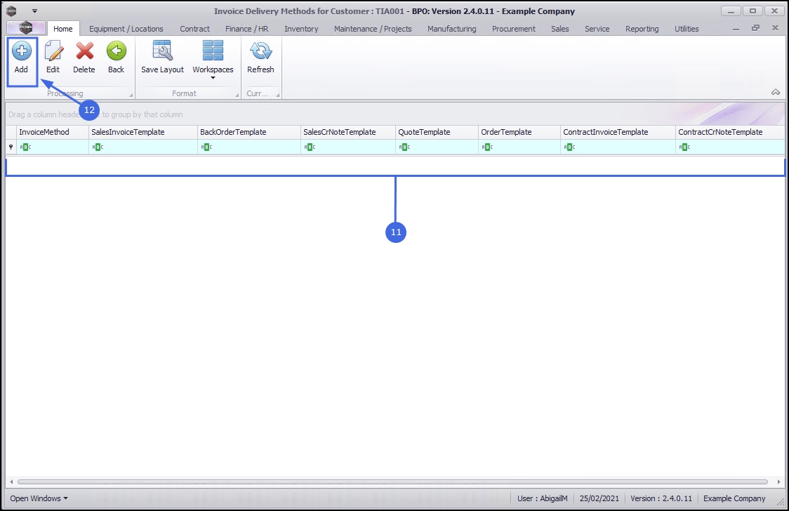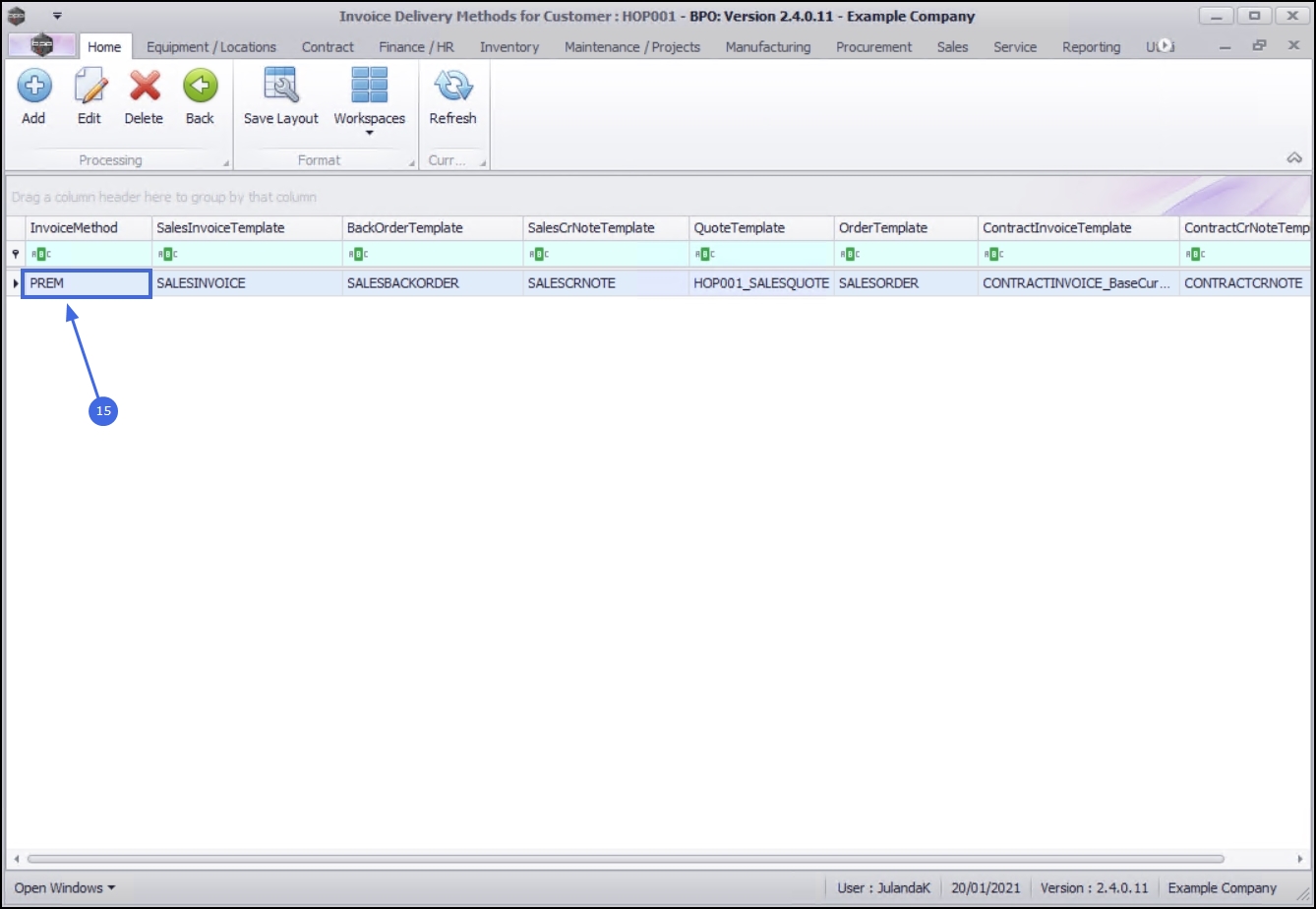 - The Invoice Delivery Methods for Customer: [Customer Code] screen will open.