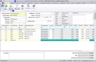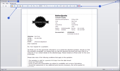 - From here you can make cosmetic changes to the document, as well as Save, Print, Export, Add a Watermark or Email the Sales Quote.