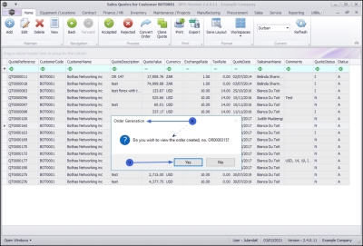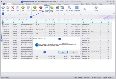 - Are you sure you want to convert quote QT[quote number], for Customer [customer code] to an order?