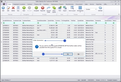 - Do you wish to close the quote QT[quote number] off? No further orders will be possible from this quote if it is closed.