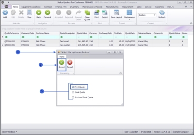 When selecting to Email the Quote, the quote will be emailed via the BPO Email Service on the server (not from MS Outlook).- The example has Print Quote selected.