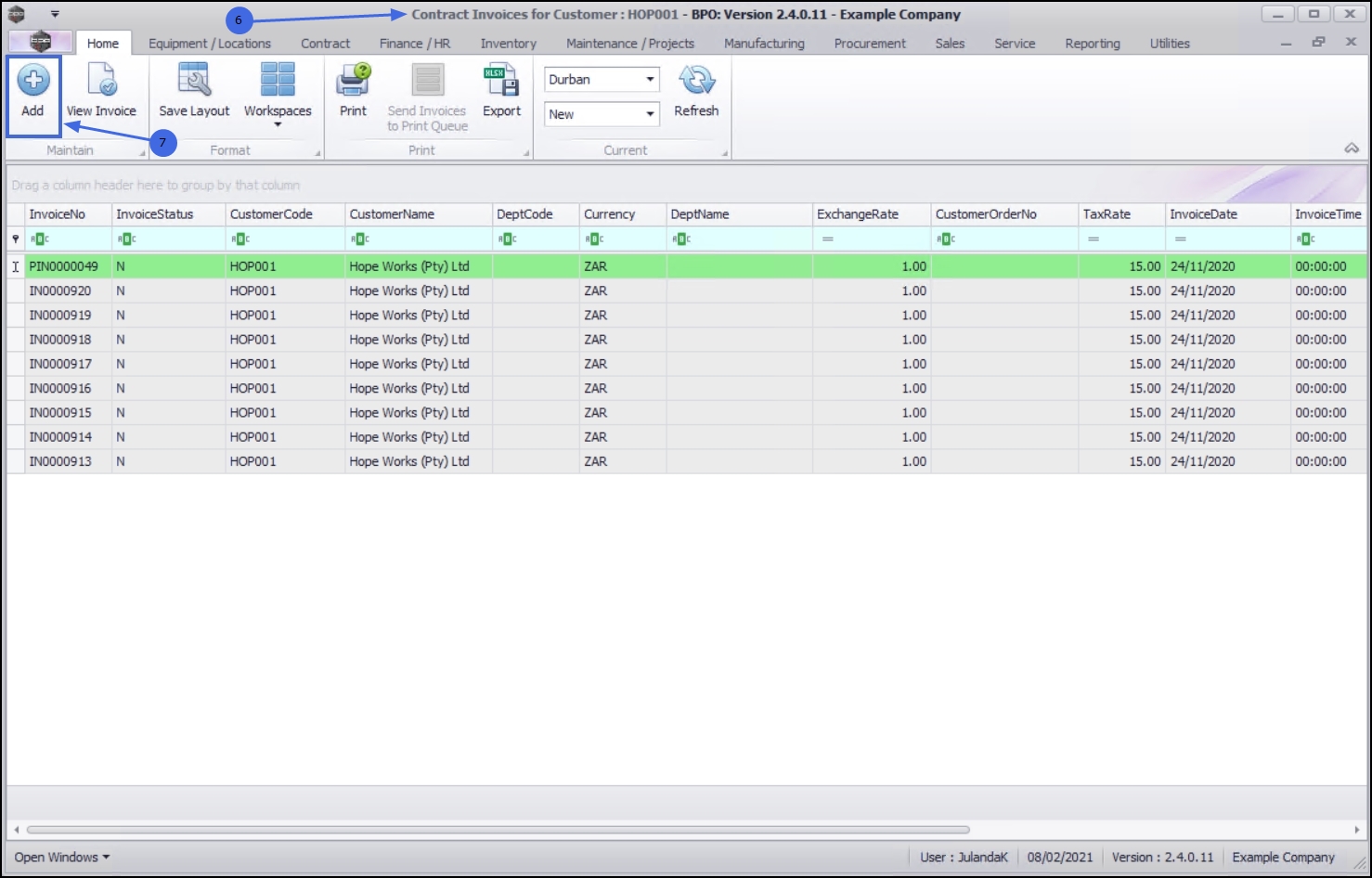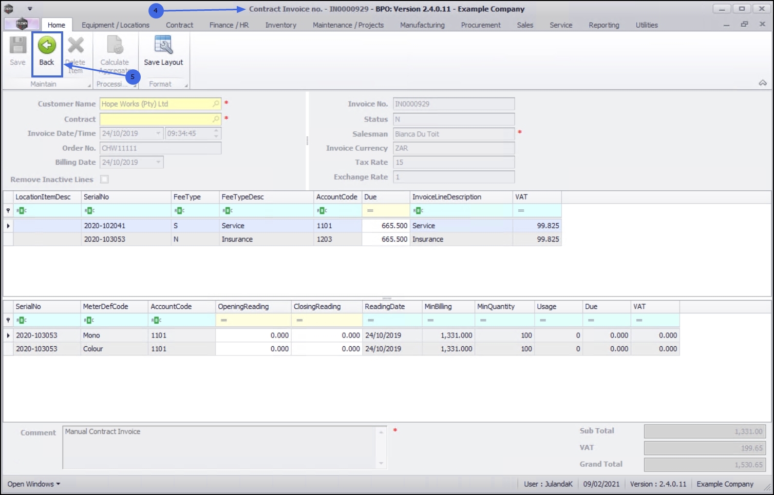 - Click on Save to save the new Manual Contract and to return to the Contract Invoices for Customer screen.