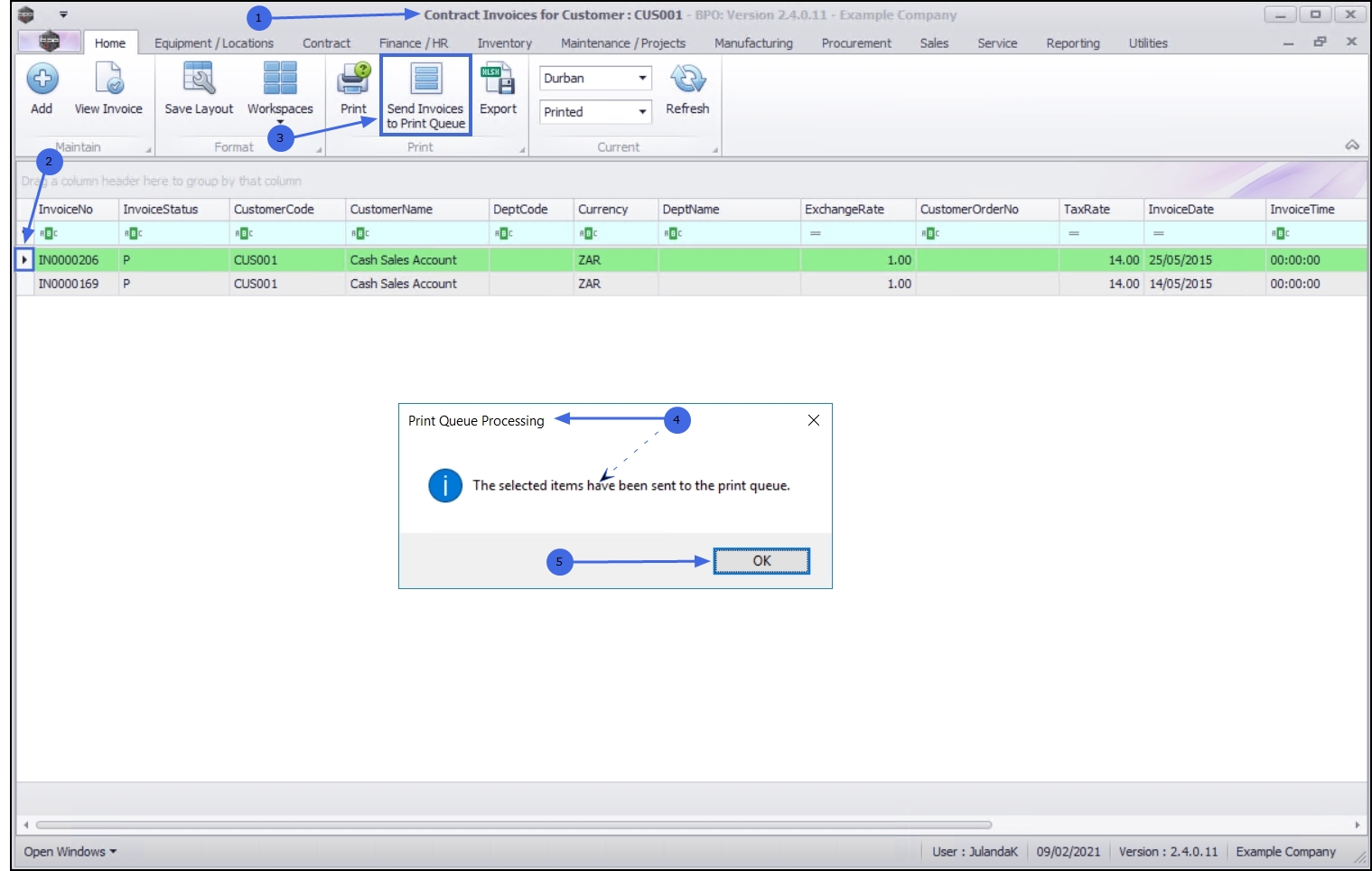 - You can send Invoices to the Print Queue directly from the Contract Invoices for Customer [customer code] listing screen, instead of going to the Print Queue Reprint screen. This means that a batch of invoices can be send to the customer.