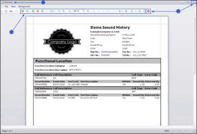 - The Items Issued History Report for the Call will be displayed in the Preview window.