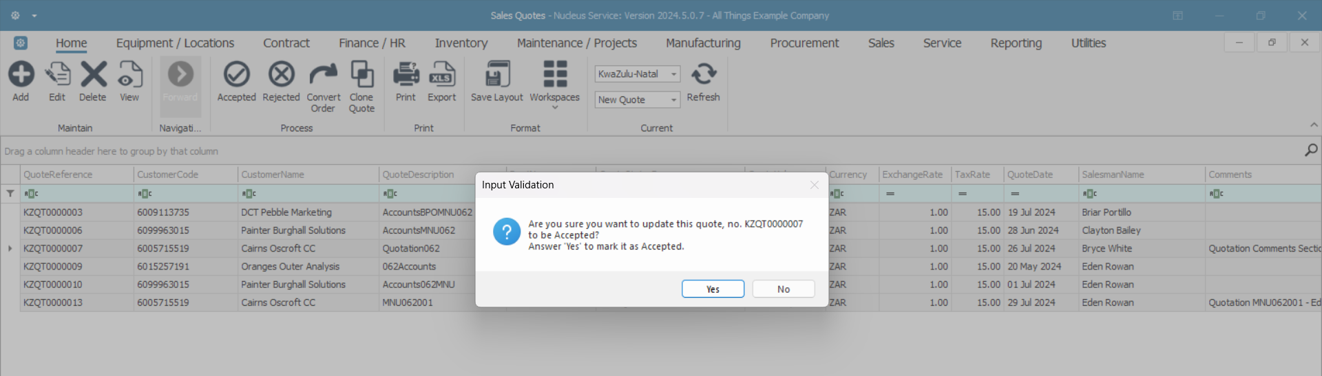 - Are you sure you want to update this quote, no. KZQT[ ] to be Accepted? Answer 'Yes' to mark it as Accepted.