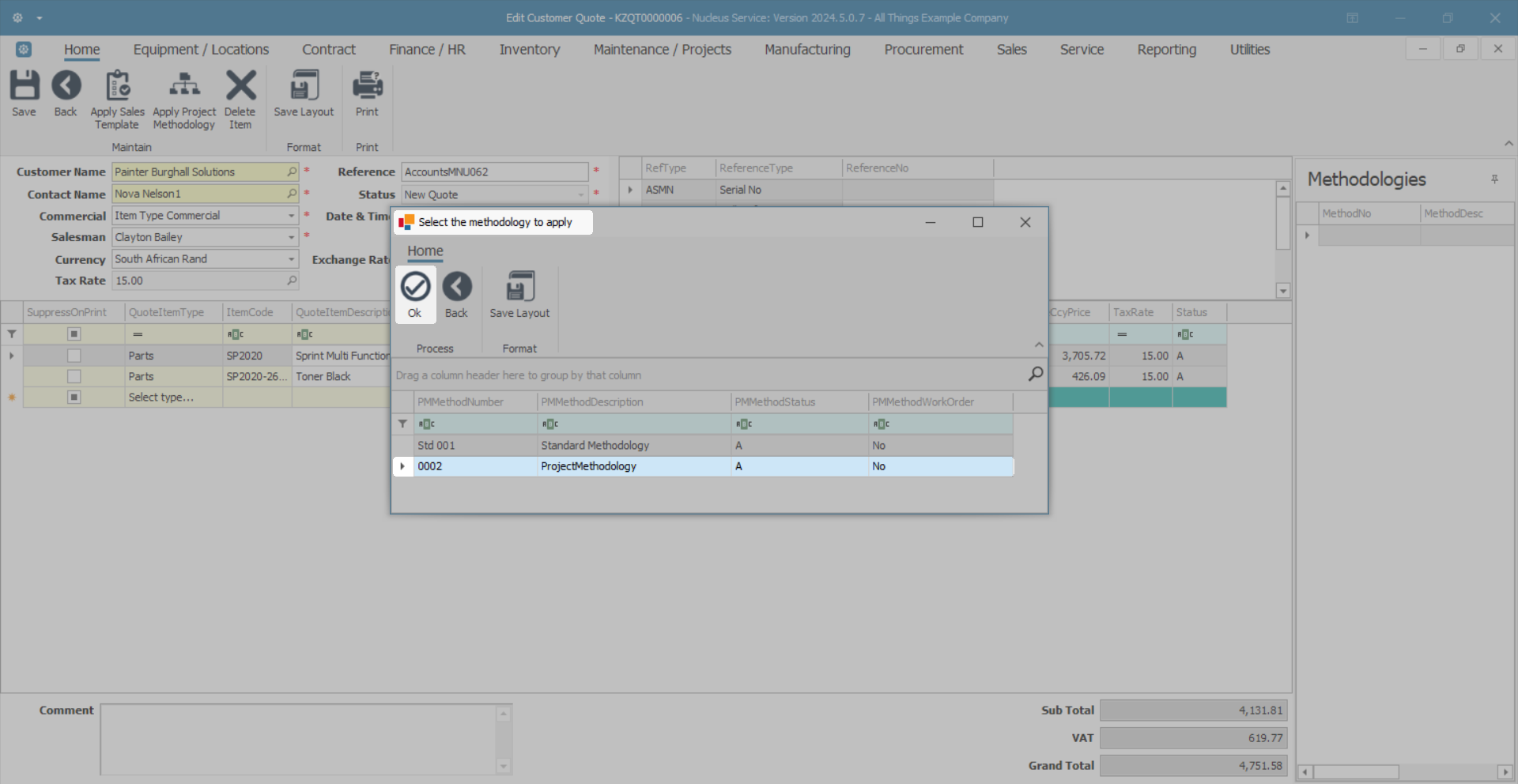 - Click on the row of the Project Methodology you wish to apply to the quote.
