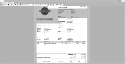 Note that the header reads Tax Invoice. The first time an invoice is printed, it will state: Tax Invoice. Each time thereafter, it will state Copy - Tax Invoice. - From the preview screen you can make cosmetic changes to the Tax Invoice, as well as Save, Zoom, Add a Watermark, Export or Email from the preview screen.