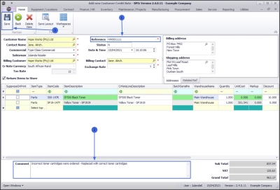 The reference number is a compulsory field and you will not be able to save the Credit Note without a reference number. - Click in the Comments text box to type a comment relating to the reason for the Credit Note. The comment will display on the Credit Note.
