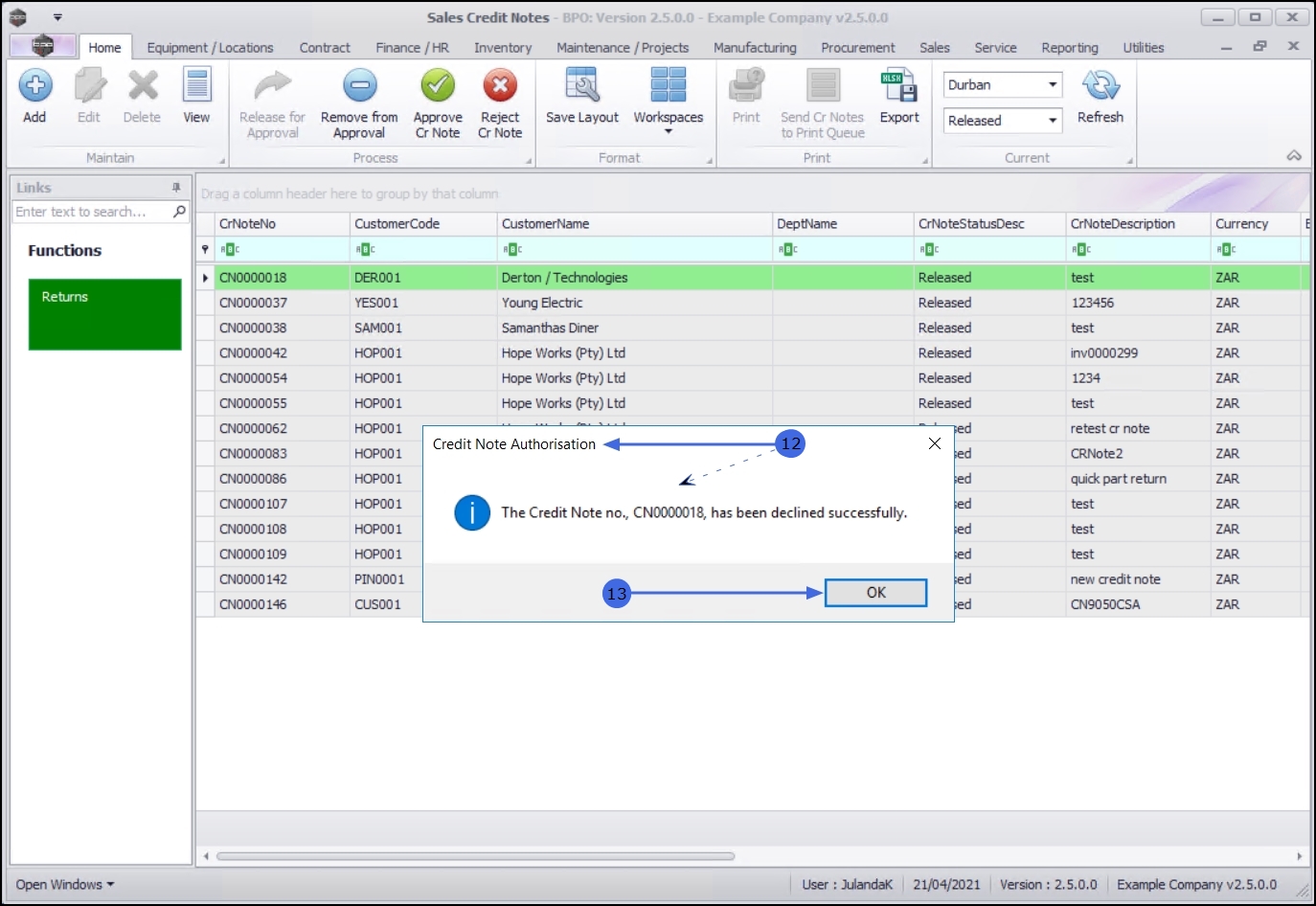 The rejected credit note can now be viewed in the Sales Credit Notes listing screen, where the Status is set to Declined.