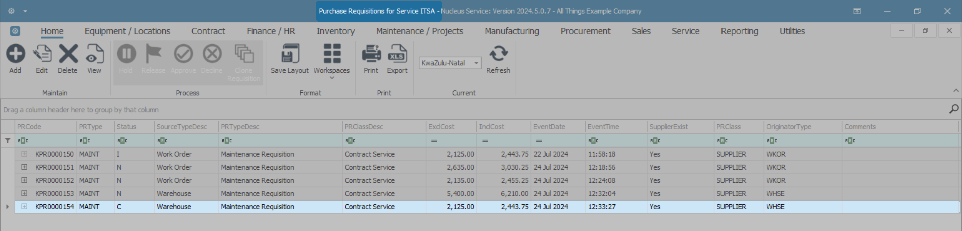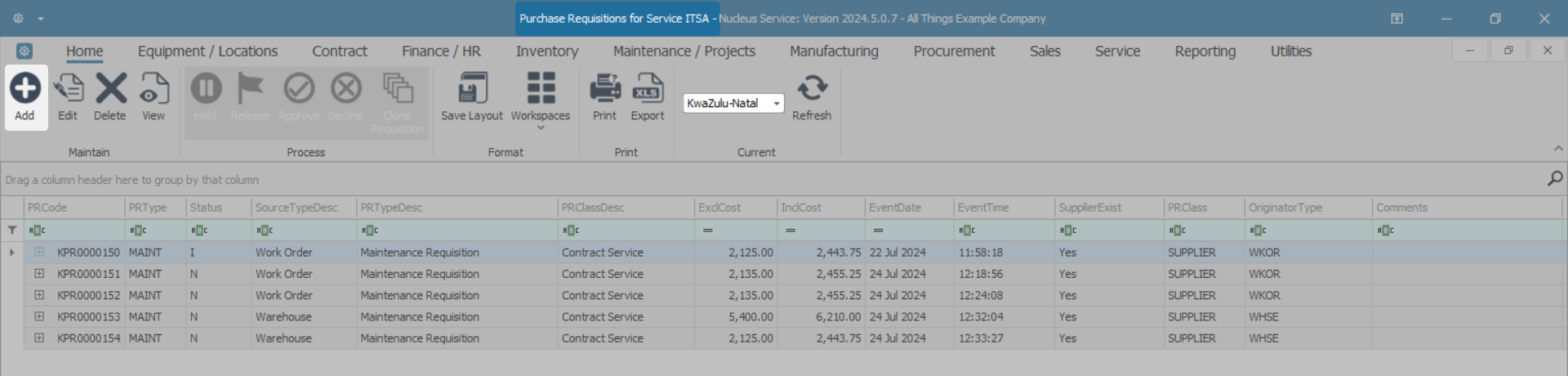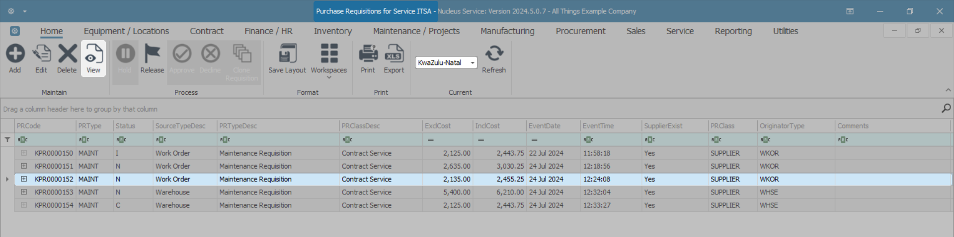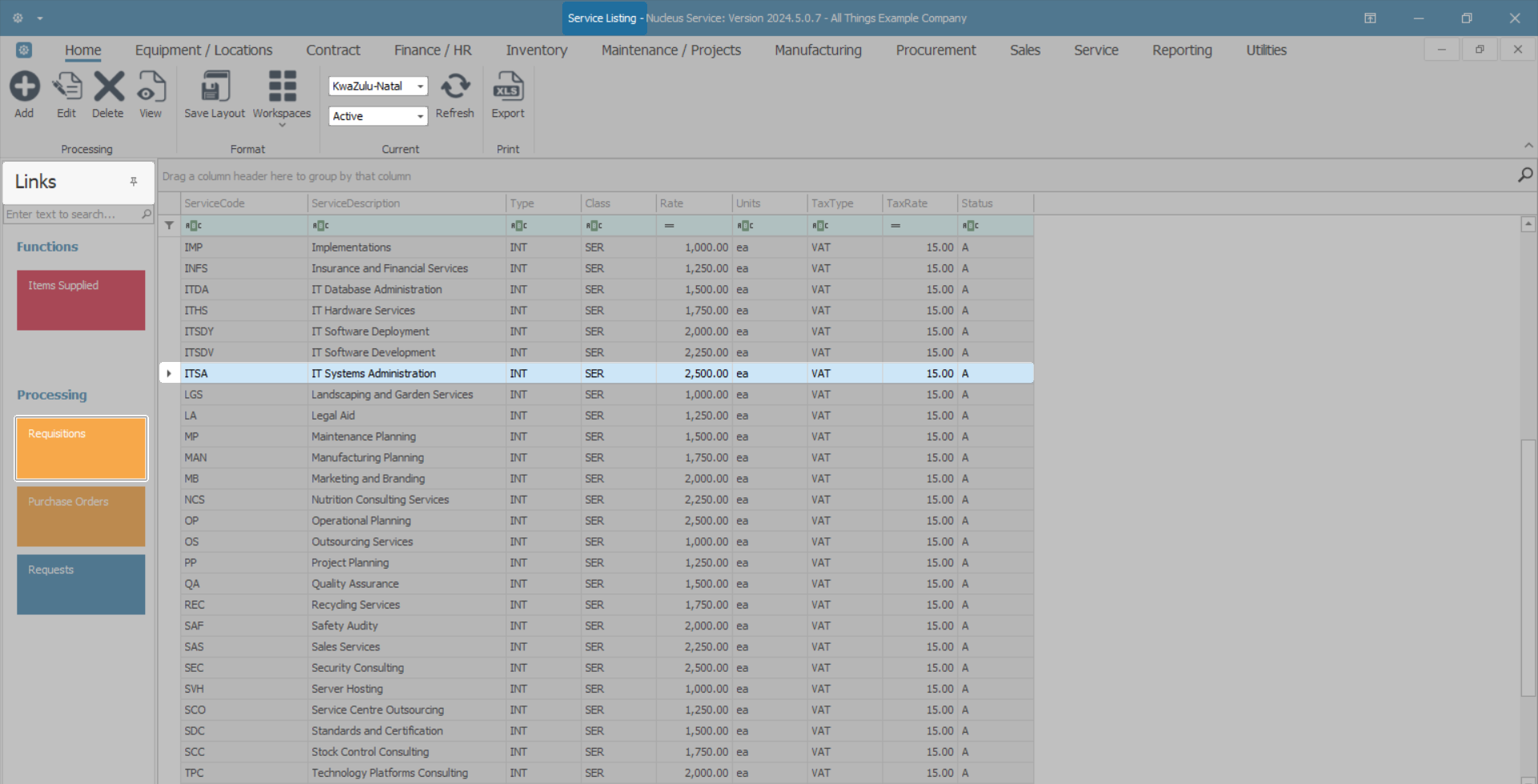 - Select the row of the Service you wish to list purchase requisitions for.