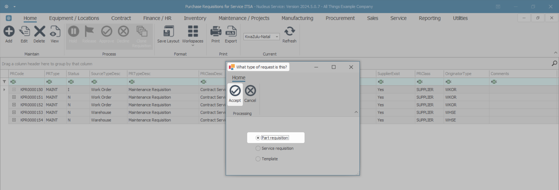 - The example has Part requisition selected.